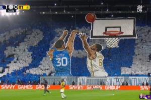 今日利雅得新月1-1战平吉达联合的沙特国家德比赛中,利雅得新月主队拉巨型TIFO致敬库里,象征着在对手球队头上轻松拿到3分,现场解说也对这个巨型TIFO的创意颇为赞赏。