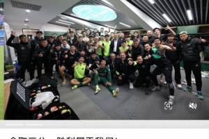 今日童磊更新社媒,晒出比赛照和赛后全队在更衣室庆祝首胜的照片,并配文写道: